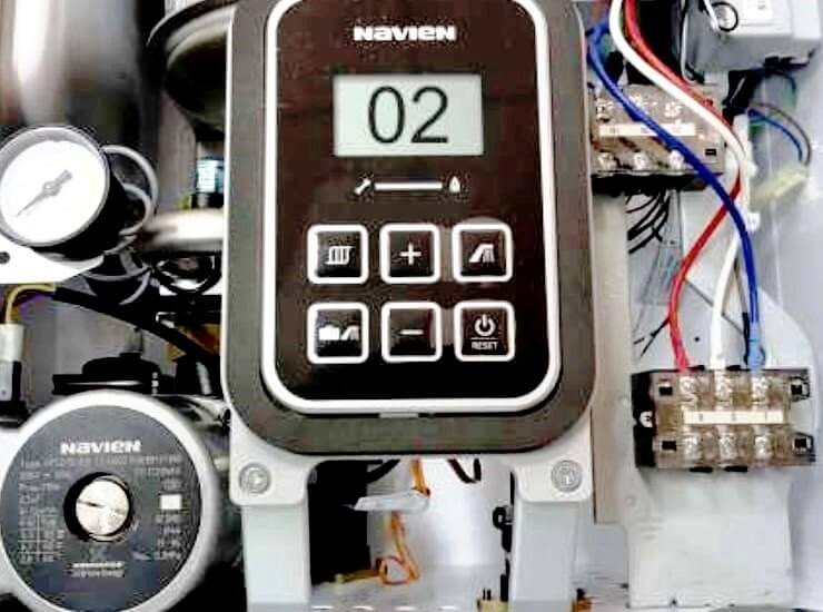 - E02 свидетельствует об ошибке циркуляции сетевой воды. Ошибка 02 на котле Навьен устраняют путем проверки контура на утечку. Давление в сети устанавливают от 1 до 2 бар, при необходимости сеть нужно подпитать. Проверяют работу запорной арматуры и трехходового клапана, возможно, они перекрыты. Проверяют работу датчика потока. Если после этих процедур неисправность не устранена, необходима замена платы.