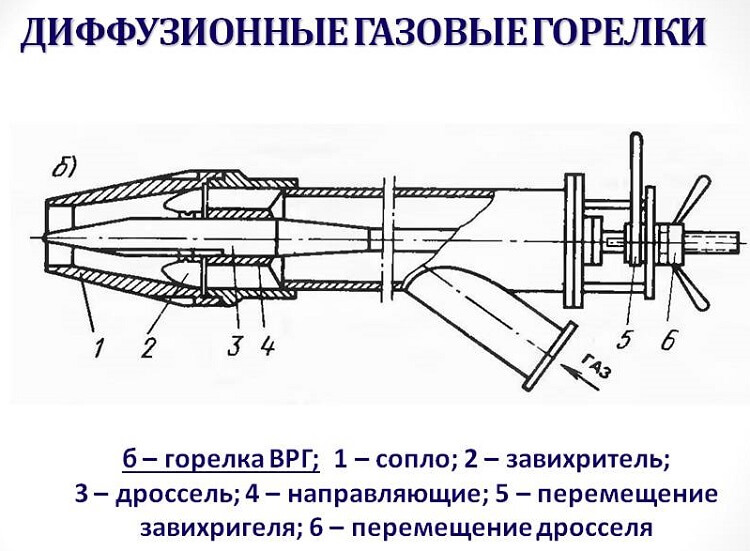 Конструкция подобного газогорелочного аппарата выполнена из ряда пустотелых каналов — форсунок, по которым поступает с огромным давлением газ, тем самым инжектирует (подсасывает) воздушные массы, имеющиеся в топочной камере.