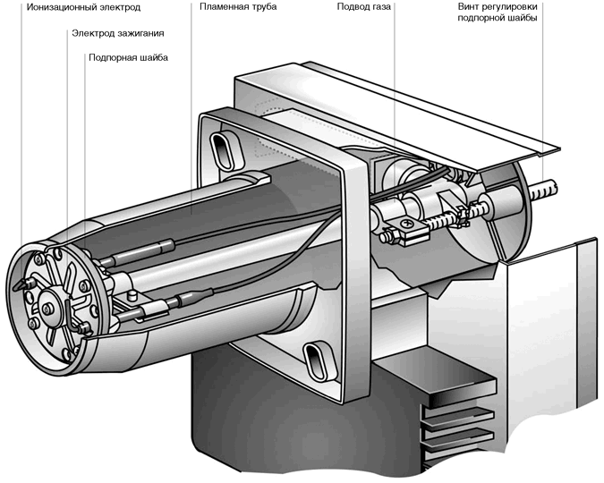 По распределительным трубкам готовая газовоздушная смесь поступает к отверстиям, на выходе из которых поджигается с применением специального запального устройства. В большинстве бытовых нагревательных котлов используется пьезозапальник