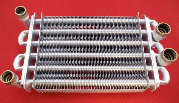 Нагрев теплоносителя в газовом котле, оборудованного битермическим теплообменным аппаратом, происходит благодаря циркуляции теплоносителя по медным каналам, сечения, которых выполнены со сложной конфигурацией внутри корпуса.