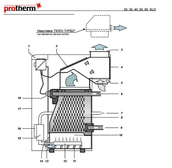 Для вывода котловых газов допускается устанавливать вентилятор и дымосос, которые обеспечат их принудительное движение. Размер выходного патрубка для включения к дымоотводу варьируется в зависимости от теплопроизводительности модели, например, для KLZ 30 — 133 мм, а для KLZ 40 — 152 мм.