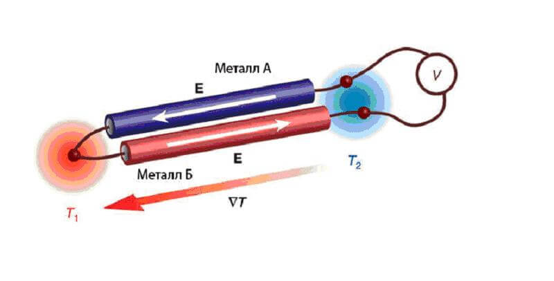 Термоэлектрический эффект в термопаре возникает на стыке 2-х объединенных в токоприемное кольцо проводников из различных металлов и сплавов. Когда ликвидус зон спайки равнозначен — разница потенциалов равняется нулю.