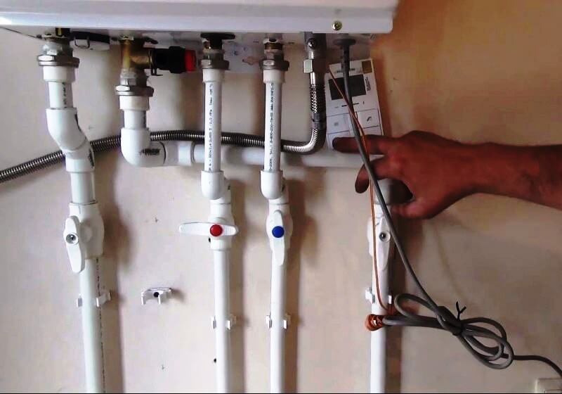 После установки котла его обвязывают со вспомогательным оборудованием и внутридомовыми инженерными сетями: насосом циркуляции, вентилятором, группой безопасности, дренажной линией, подпиточной линией, системой отопления и горячей воды, газовым трубопроводом и дымоотводной системой.