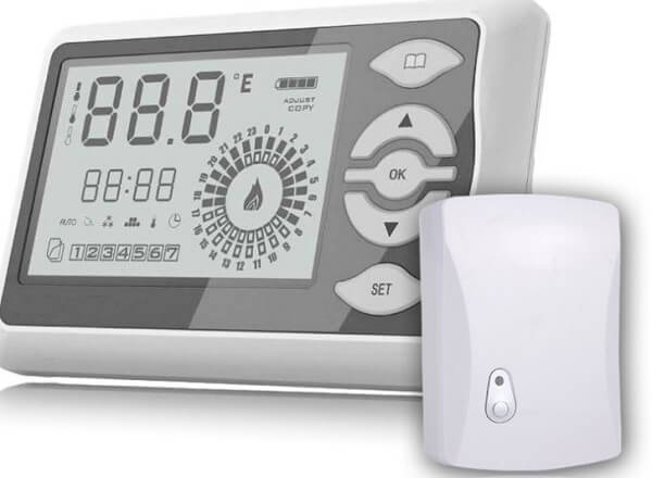 Беспроводные термостаты для котла отопления выполнены в виде приемника и передатчика. Отличительной особенностью изделий такого типа является отсутствие необходимости в прокладке проводки. Сигнал передатчика может поступать на расстояние 20-30 м. Это позволяет устанавливать пульт управления в любом помещении.