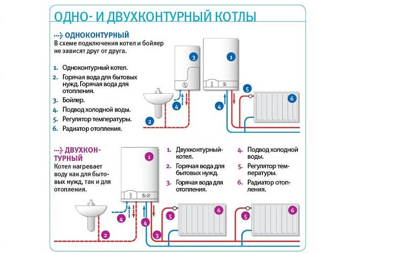 Обе эти вариации котлов, работающих на газовом топливе внешне практически неотличимы, они в равной степени просты в управлении тепловыми процессами, эффективны и долговечны. Конструкция их отличается внутренним устройством, который определяется видами вырабатываемых услуг.