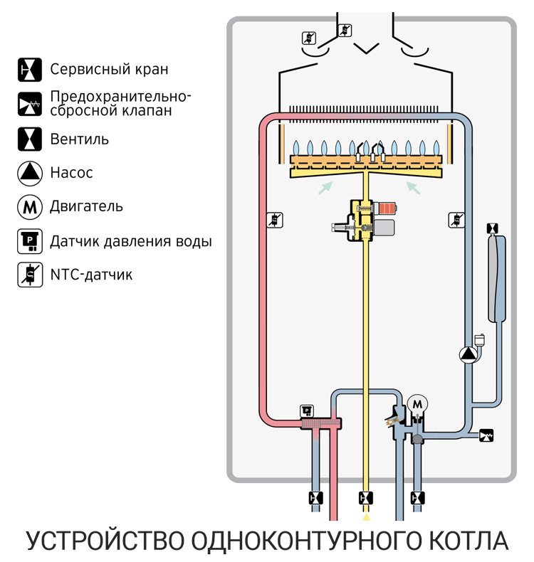 Работа одноконтурного котла происходит при подаче газа на горелочное устройство, где запальником осуществляется автоматический розжиг газовоздушной смеси.