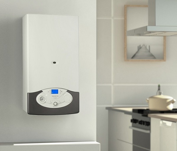 Навесной котел в интерьереАгрегат работает с наддувом в закрытой камере сгорания и оборудован коаксиальной дымовой трубой. Часовой расход природного газа при настройки рабочего режима, составляет 2.86 м3/час, а сжиженного — 2.13 кг/час, КПД установки — 93.8%, цена — 45000 руб.