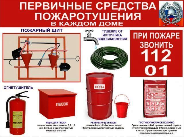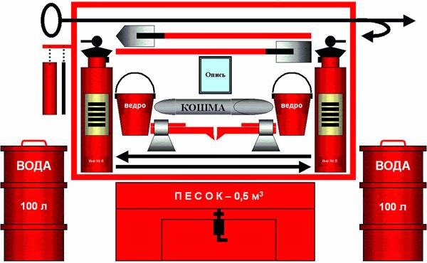 Первичные средства пожаротушения фиксируют на пожарных щитах и помещают в пожарных шкафах. Щиты располагают, если в помещении отсутствует внутренний водопровод, а пожарный гидрант располагается на дистанции не более 100 м.