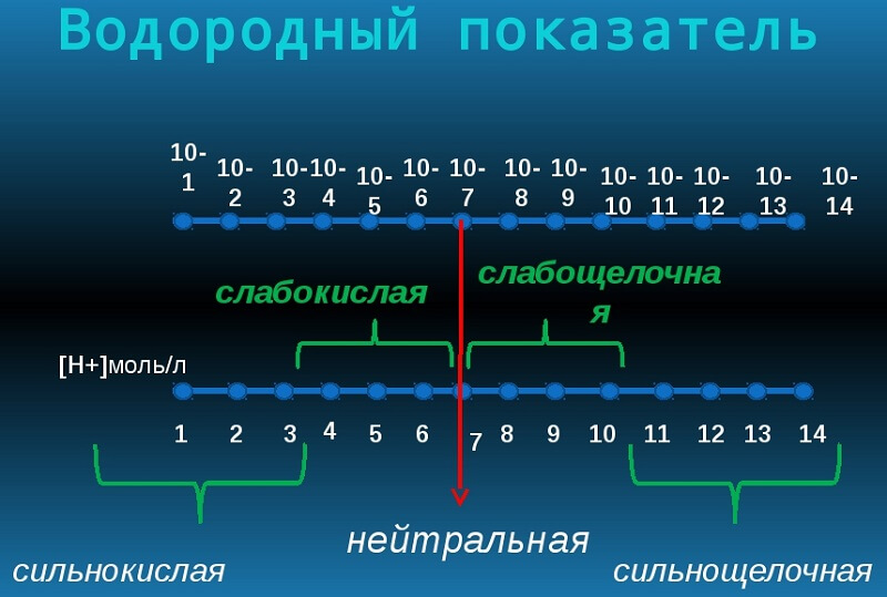 Если преобладают Н+, раствор считается кислотным, и имеет рН от 0 и 6.9. Когда больше ОН-, то раствор будет иметь щелочную характеристику с показателем рН между 7.1 и 14. В том случае, если число Н+ и ОН- равны между собой — вода имеет нейтральную характеристику, с показателем 7.
