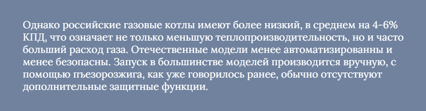 Популярностью пользуются изделия производства РФ. Газовые котлы российского производства имеют привлекательную стоимость в сравнении с зарубежными изделиями, и неприхотлив к качеству используемого энергоносителя.