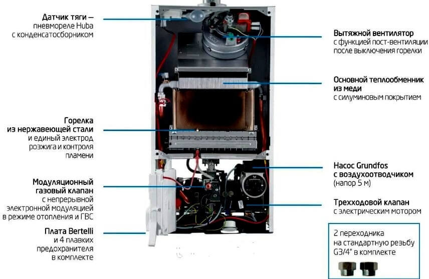 Ограничение температуры обратного теплоносителя устанавливается заводом изготовителя для конкретной модели агрегата, чтобы противодействовать процессу образования конденсата в дымовых газах. Для распределения теплоносителя по разным контурам потребуется установка котла Бакси с гидравлическим коллектором и отдельными насосами циркуляции на каждый контур.