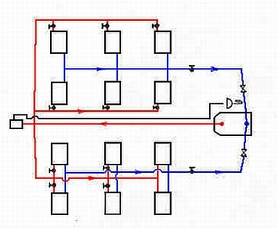 Недостаток такой схемы, в том, что первые по ходу теплоносителя батареи перегреваются, а последние недогреваются. Эффективность схемы можно повысить, если интегрировать в контур циркуляционный насос, что позволит увеличить площадь нагрева от 40 м2 до 150 м2.