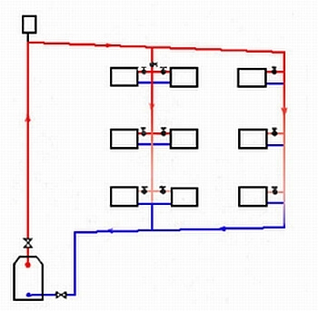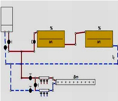 Благодаря такой схеме радиаторы нагреваются равномерно и при необходимости могут быть полностью индивидуально отключены.