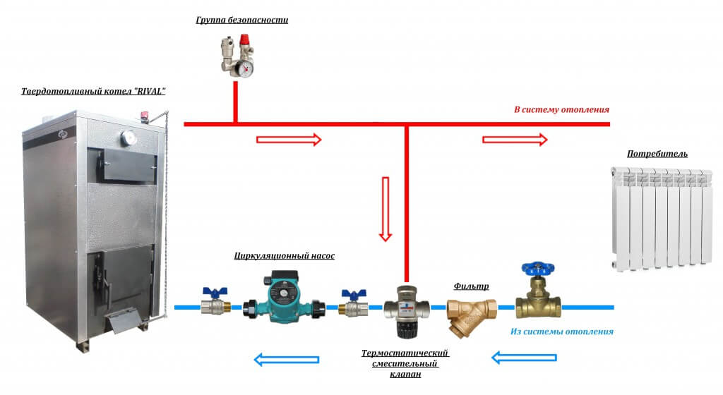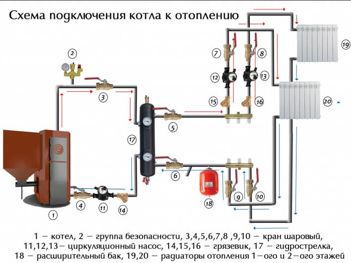 Все что находится между оборудованием и батареями называют обвязкой напольного газового котла, основными элементами являются: