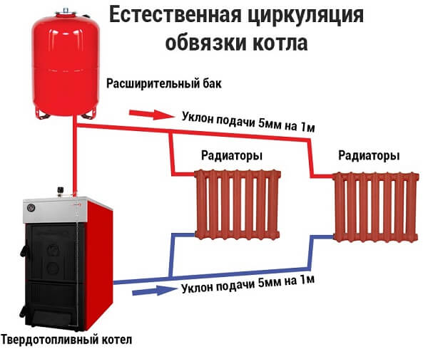 Поскольку топливо перерабатывается интенсивно, то отработанные газы не отличаются высокими температурами. При монтаже дымохода в стену делают небольшой уклон, чтобы конденсат стекал наружу, а не внутрь. Используя коаксиальную трубу, можно реализовывать только схему обвязки газового котла для отопления закрытого типа.