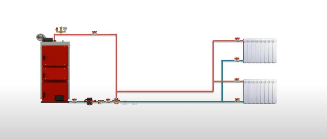 Этот тип конструкции предполагает наличие только отсечных кранов, которые устанавливают на входе в агрегат. Элементы нужны для того, чтобы в случае поломки оборудования отключить его от теплоносителя и произвести необходимые манипуляции. Дополнительно на обратной магистрали устанавливают фильтр, чтобы накопившийся осадок и грязь из жидкости не поступала в аппарат. Составляющую системы можно в любой момент почистить или заменить новой.