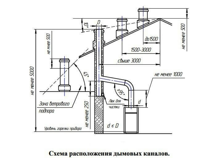 - Высота трубы над кровлей ставится выше уровня ветрового подпора, и не меньше 50 см выше конька кровли.