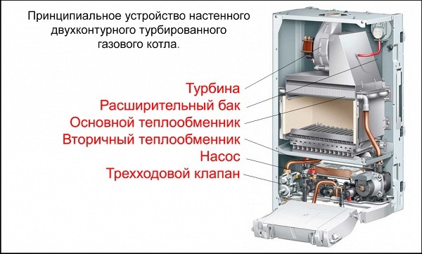 Название «турбированный» говорит о том, что в котле есть турбина, то есть вентилятор, подающий воздух, поддерживающий горение и отводящий продукты сгорания. Конструкция предполагает закрытый тип сгорания и систему дымоудаления с несколькими поворотами.