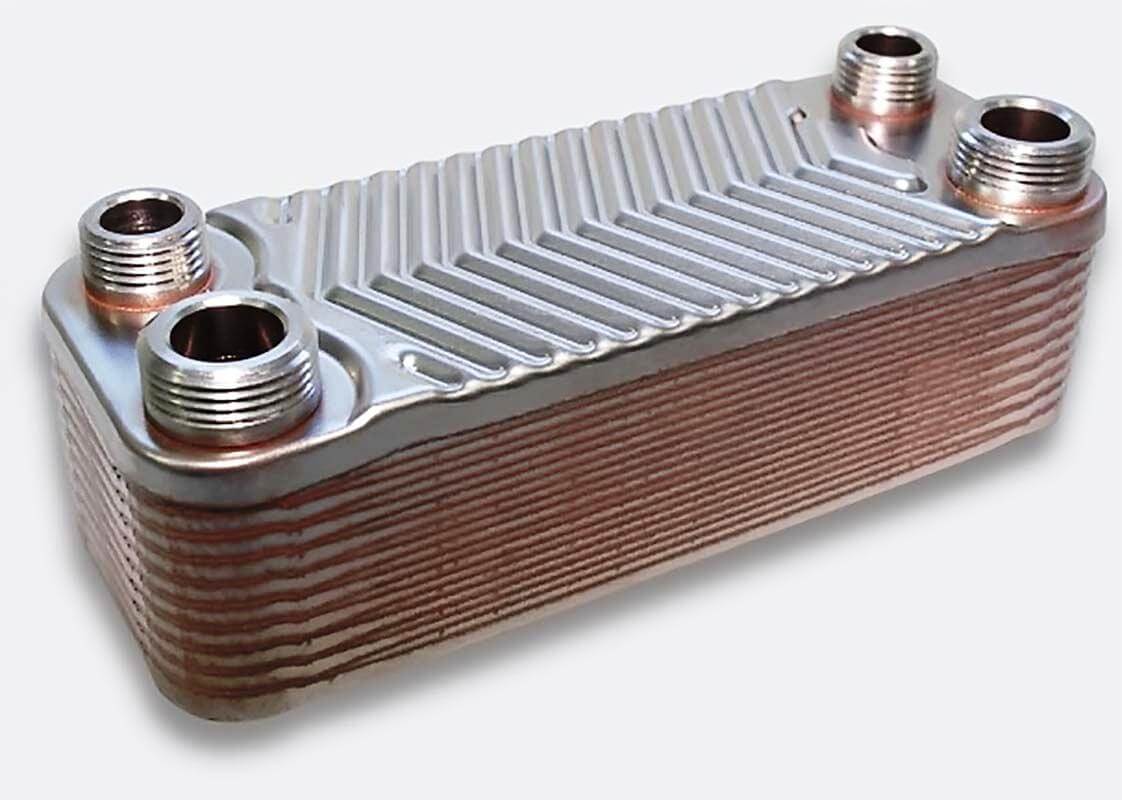 - Практически все настенные агрегаты комплектуются медными теплообменниками, в отличие от чугунных в напольных агрегатах. Медь придает отопительной конструкции легкость, но при этом быстро изнашивается и требует высокий уровень очистки циркулирующей воды. Если ее не выполнять, медь окисляется, а внутренние поверхности нагрева будут забиваться накипью. Из практики следует, что медный котловой теплообменный аппарат даже при хорошей эксплуатации способен отработать не более 5-8 лет, при уровне 12-18 для чугунного варианта.