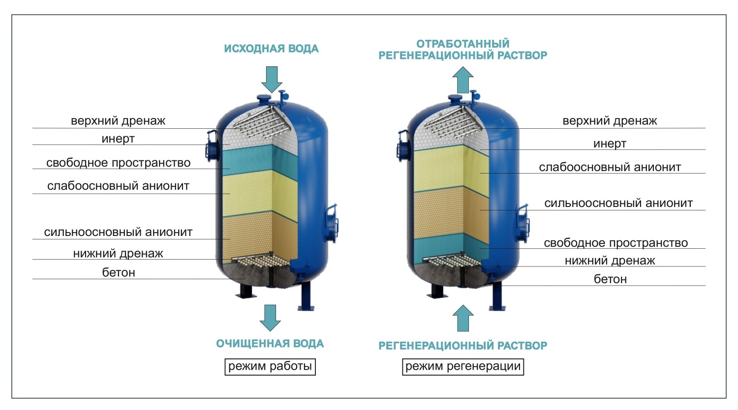 На этапе регенерации подготовленный теплоноситель разводят 26-ти процентным раствором натриевой соли. Для этого ионный фильтр комплектуется отдельным баком, в котором готовят солевой раствор. Кроме этого очистные установки обеспечиваются дозирующими комплексами, осуществляющими реагентную обработку жидкости.