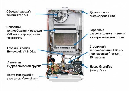 Битермический теплообменный аппарат снаружи не выделяется от стандартного котлового отопительного бойлера. Только внутри поверхности нагрева для отопления и ГВС разделены трубками сложной конфигурации, похожей на ромб.