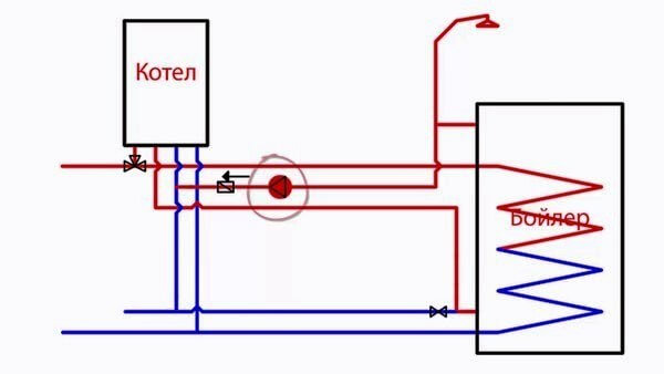 Подобная схема горячего водоснабжения стабилизирует температурный режим в системе ГВС, исключая скачки. При потреблении объема ГВС, бойлер сразу же пополняется горячей водой из котла. Подсоединение выполняется к патрубку ГВС.