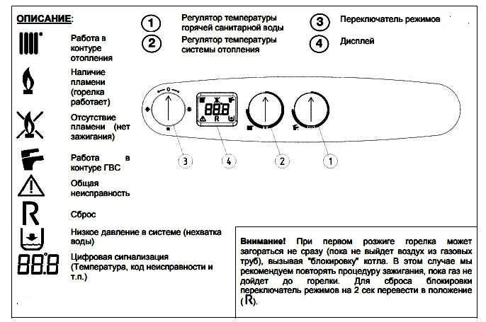 - регулятором температур устанавливают режим работы в контуре отопления и ГВС.