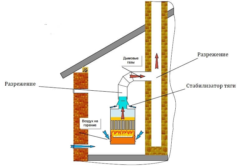 Организация дымоотвода по принципу естественной тяги — традиционная схема, пришедшая в теплотехнику с древних времен, начиная от очага и русской печи. Движение уходящих газов по каналам происходит благодаря разности плотности между горячими топочными газами и холодным атмосферным воздухом.