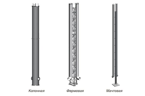 В качестве опорной конструкции применяется мачта. К ней монтируют 1-3 газоотвода. Мачту устанавливают на фундамент при помощи анкеров. Дымоходы обладают следующими преимуществами: