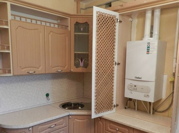 Многие собственники используют для этого кухонную стенку. Перед тем как закрыть в шкафу в кухне частного дома такой газовый котел, потребуется учесть не только дизайнерские пожелания владельца, но и выдержать требования пожарной безопасности.