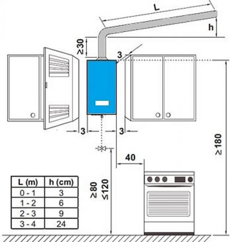 Для этого в фасадной части мебели, выполняют специальные отверстия, обеспечивающие конвекционный процесс воздухообмена. С целью выполнения профессионального расположения настенного газового агрегата, который бы сочетался с кухонным гарнитуром, нужно учитывать место прохождение системы дымоотвода. Его размещают поближе к месту, выхода трубы на улицу.
