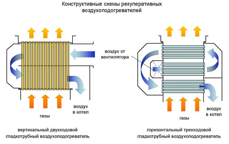 Наиболее распространенными в нагреве воздушной массы, подаваемой в камеру сгорания, являются трубчатые устройства. Существует несколько типов воздухоподогревателей, отличающихся по своей конструкции.